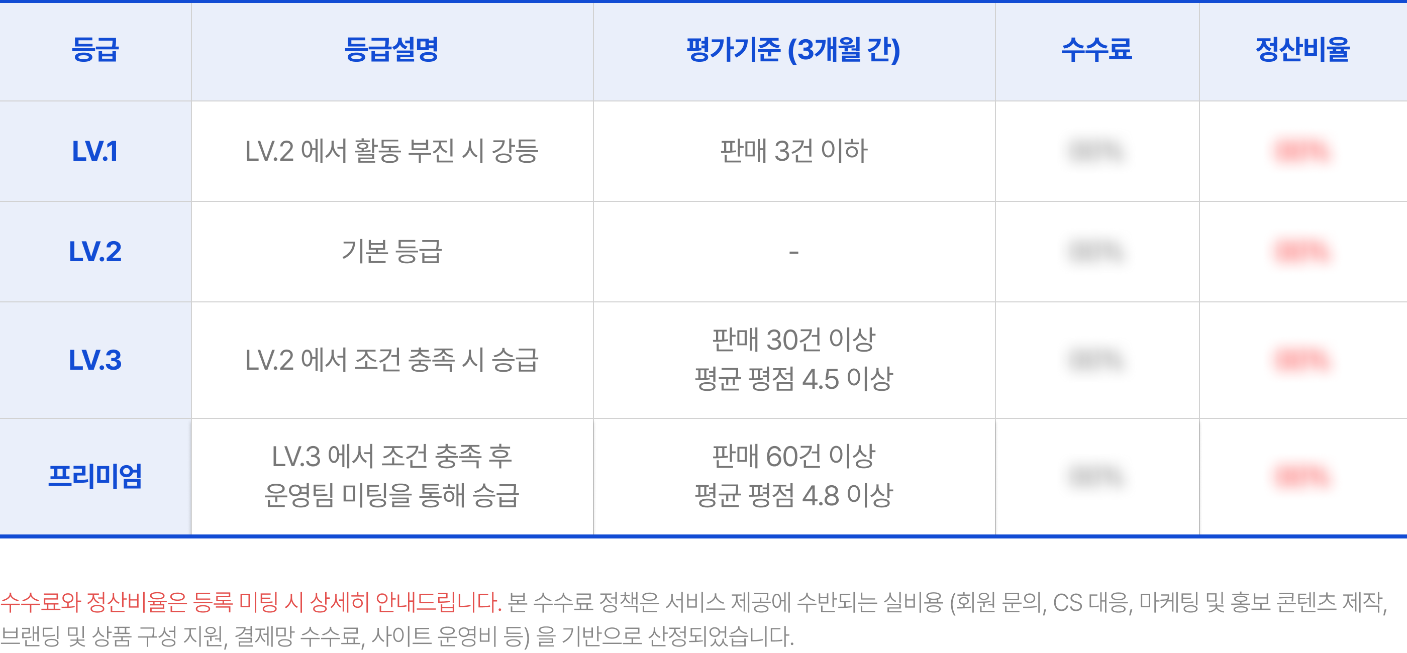 정산비율은 활동에 따라 최대 90%까지 올라갑니다. 성장할수록 더 높은 수익과 브랜드 노출 기회를 누리실 수 있습니다.